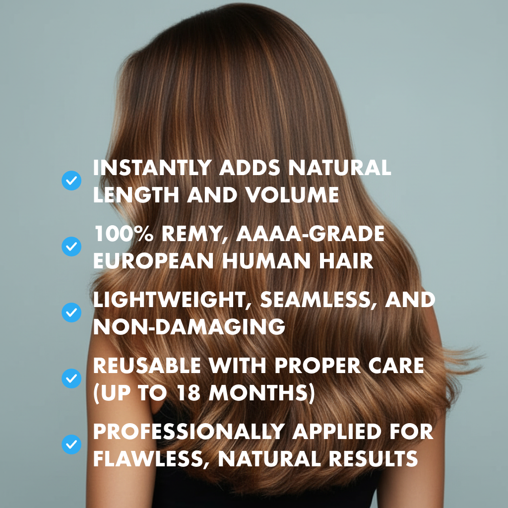 Add natural length and volume with 100% Remy human hair. Lightweight, reusable, non-damaging, and professionally applied for seamless results.